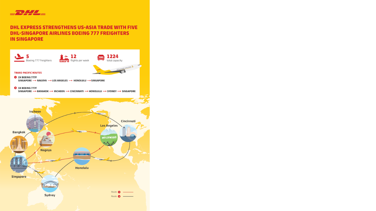 Starting December 2023, three of the five Boeing 777 freighters will ply the Singapore-Bangkok/Taipei-Incheon/Nagoya-Cincinnatti-Honolulu-Sydney-Singapore route seven times a week. The other two will cover the Singapore-Nagoya-Los Angeles-Honolulu-Singapore route five times a week. With these services, DHL Express significantly enhances its international air network capacity by taking advantage of Singapore’s strategic location and position as a key air cargo and logistics hub. Customers looking to ship between Asia Pacific and the U.S. West Coast can expect shortened delivery times to one day for their cross-border time-sensitive shipments.
