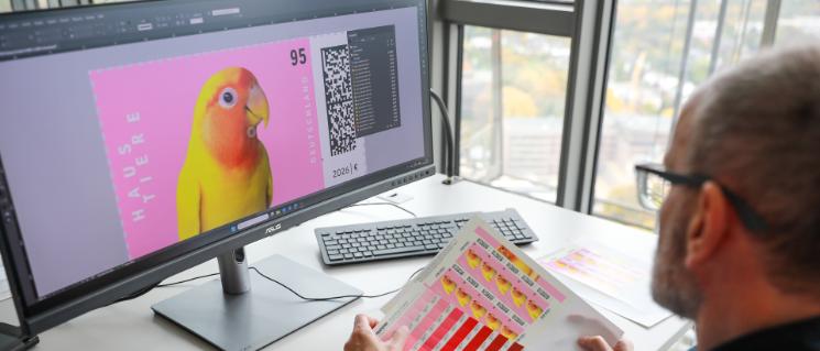 Für die Gestaltung nutzen die Grafiker:innen auch Bilddatenbanken. Wenn Bildmaterial bei Lizenzgebern liegt, werden entsprechende Verträge geschlossen.