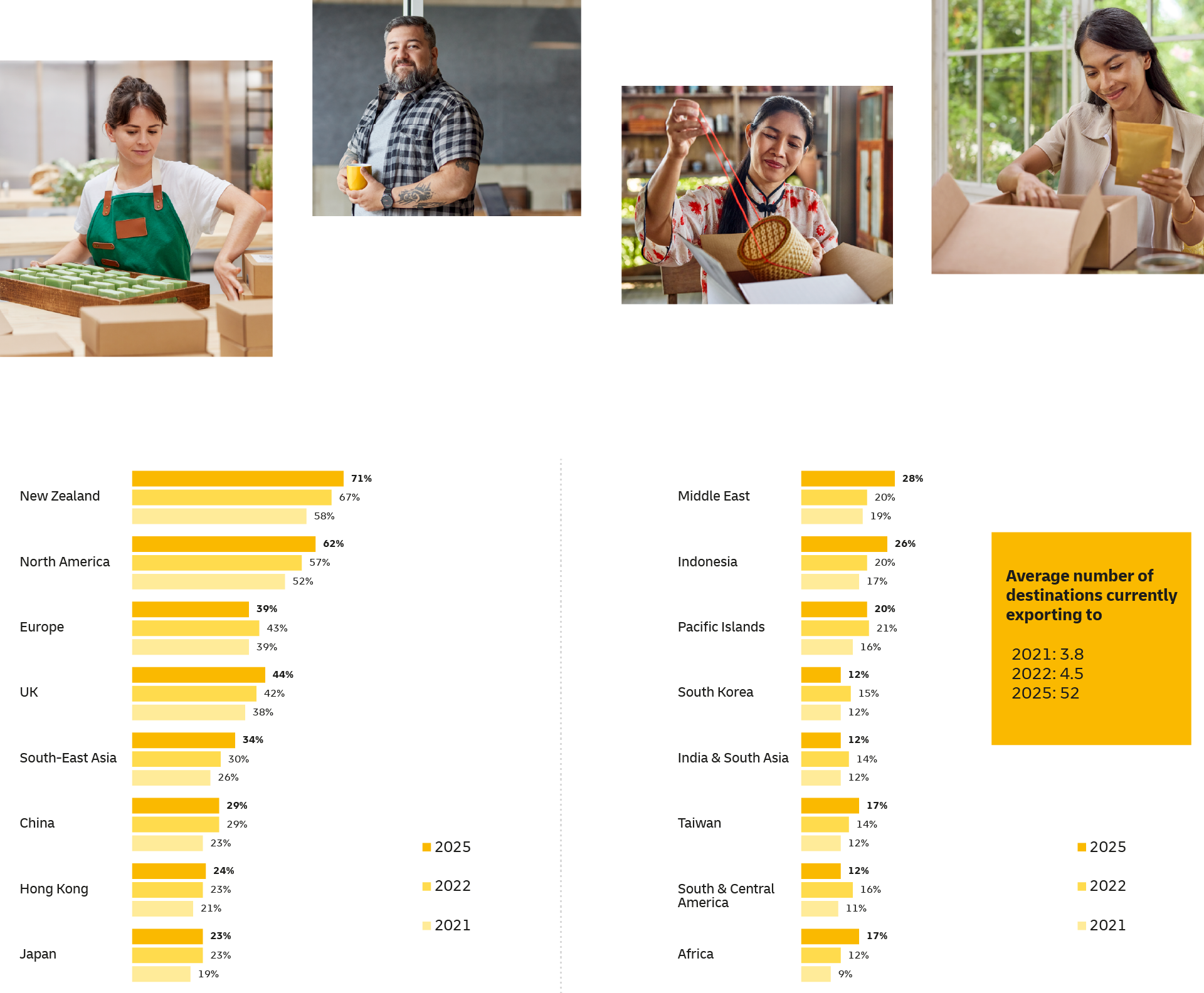 - Top markets: New Zealand remains the top trading partner for Australia exports. The average number of export markets per trader has grown from 3.8 in 2021 to 5.2.
