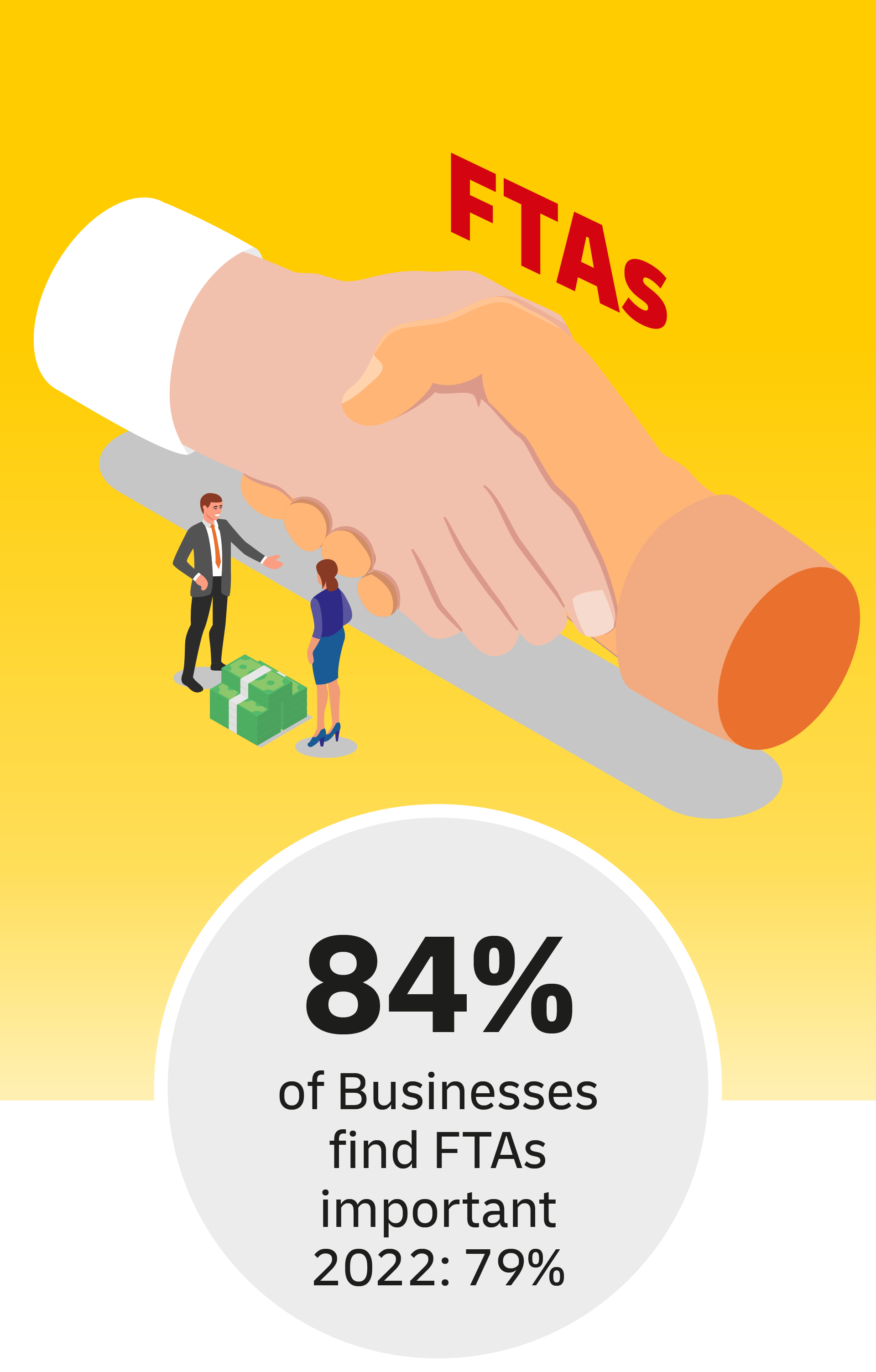 FTAs are now perceived as a crucial tool for competitiveness. 84% of traders now view FTAs as a key part of their decision to export to new countries, up from 79% two years ago.