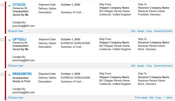 MyDHL+ can import shipment data contained within a CSV file. This enables the user to create one or many shipments automatically.