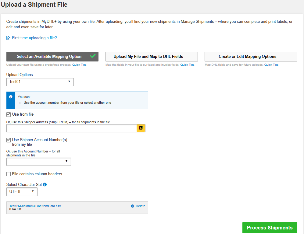 You first need to configure and save a Mapping Option by matching the fields required by MyDHL+ to those in your CSV file.