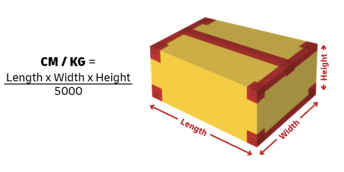 The volumetric weight formula is Length (cm) × Width (cm) × Height (cm) ÷ 5000, then rounded up to the nearest 0.5kg. For example, if a carton's dimensions are 40cm × 30cm × 30cm, its volumetric weight is 7.2kg, which is rounded up to 7.5kg as the billing basis.