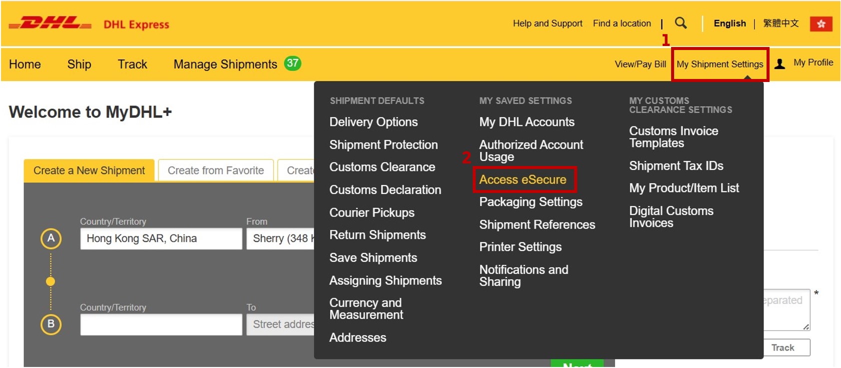 Step 1: After logging in to MyDHL+, go to ‘My Shipment Settings’ in the top right navigation.