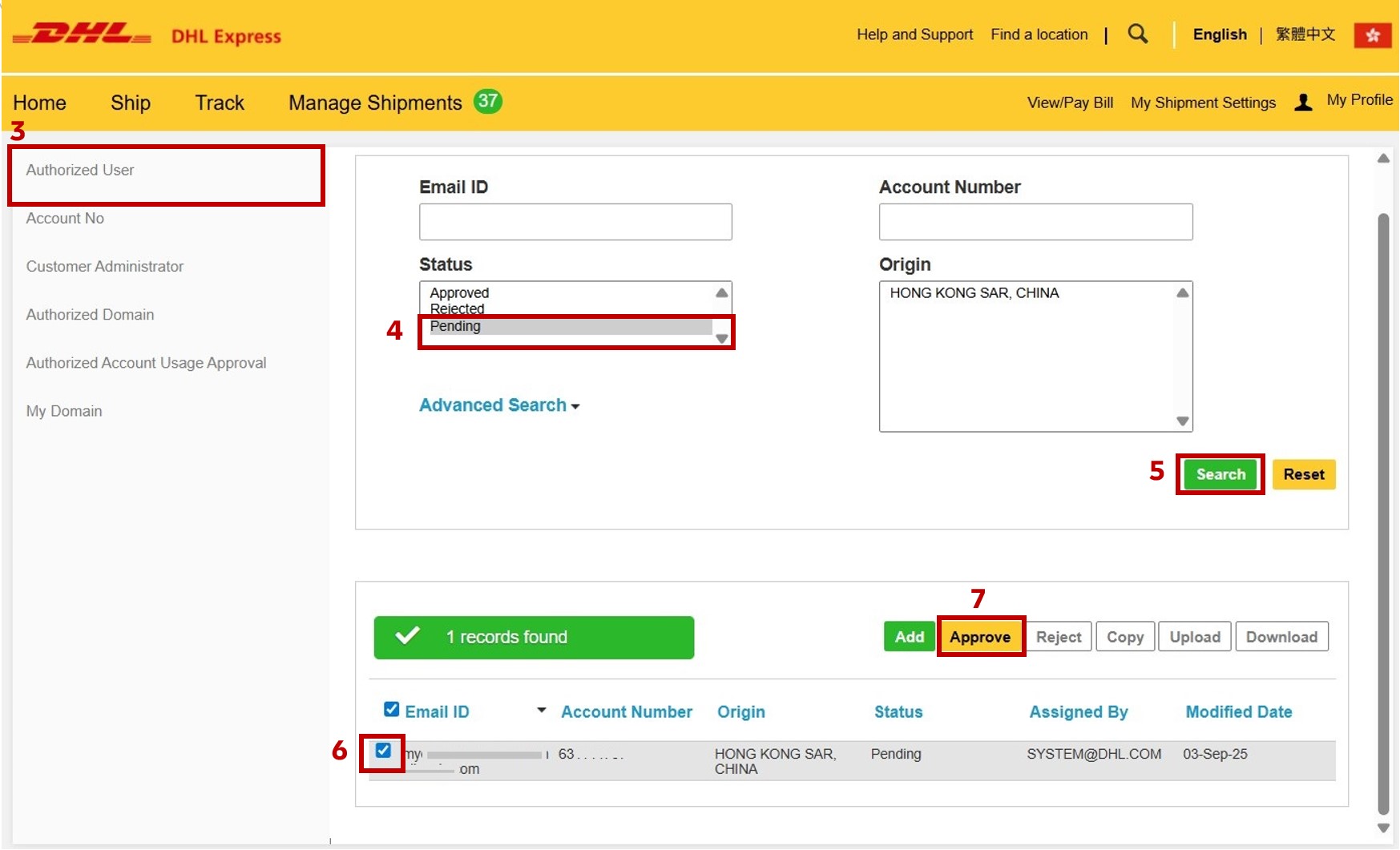 *If both options are unchecked, approval will need to be completed by logging into MyDHL+.