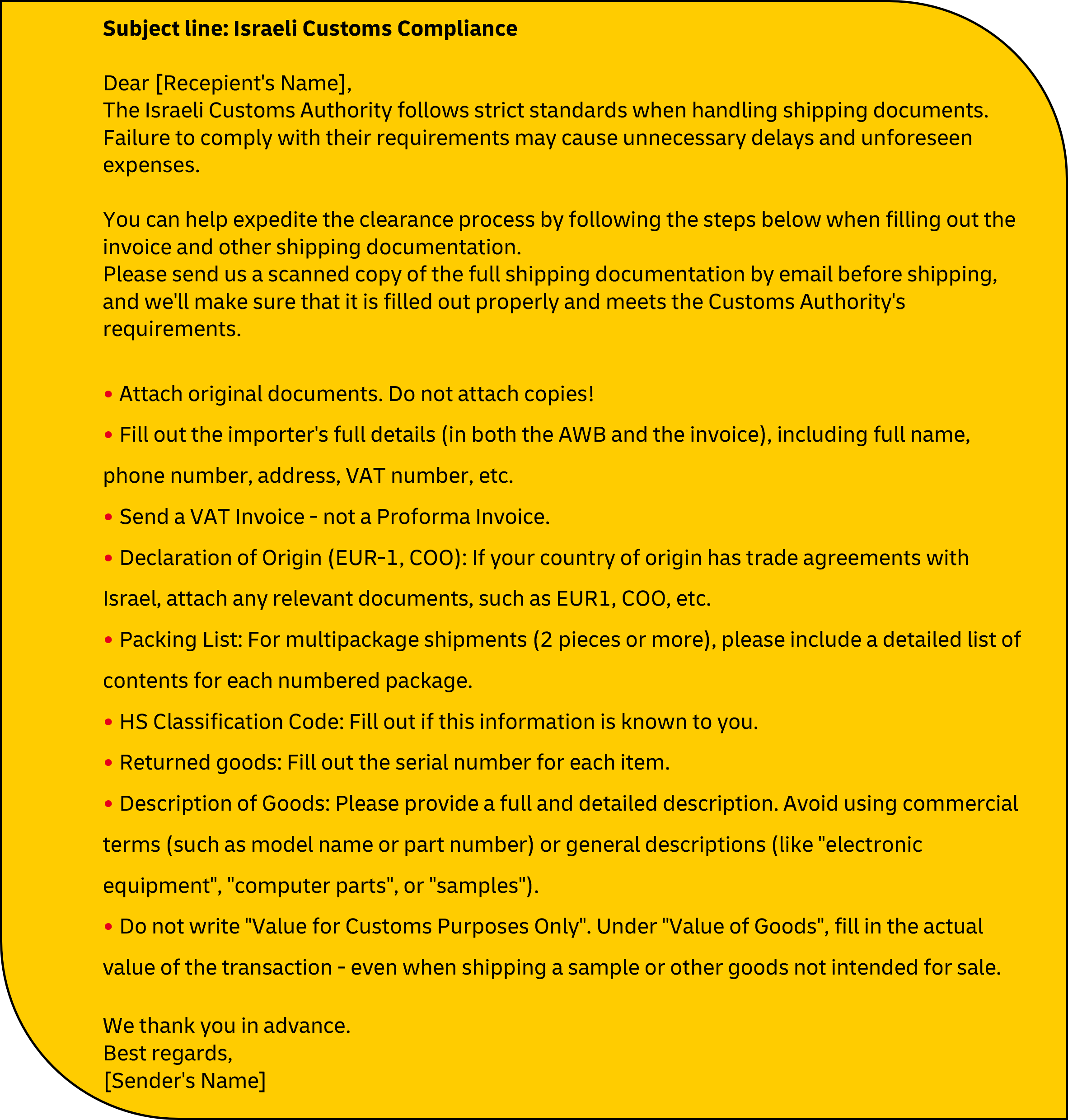 - Preference documents/declaration of origin: When shipping from a country that has trade agreements with Israel, acceptable and valid preference documents (EUR1, COO, etc.) must be attached.