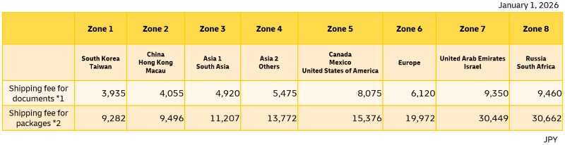 - *1 : Shipping rate for documents up to 0.5 kg. Additional charges apply for documents exceeding 0.6kg, in increments of 0.5kg.