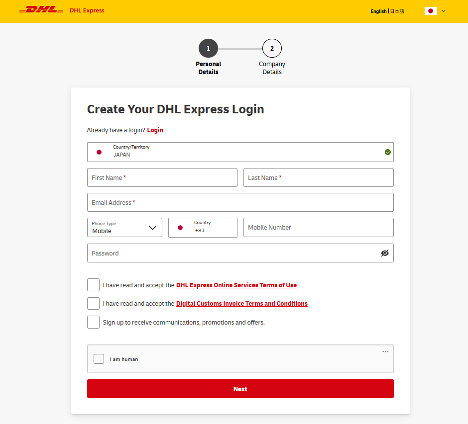 To use MyDHL+, a one‑time registration is required. Then, log in to your account to arrange shipments easily.