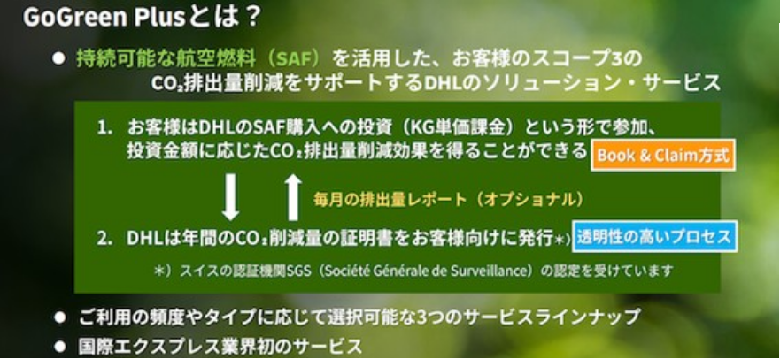 DHL’s GoGreen Plus reduces greenhouse gas emissions generated during transportation through the use of Sustainable Aviation Fuel (SAF). While maintaining high service quality and efficiency, it supports the decarbonization of your supply chain.