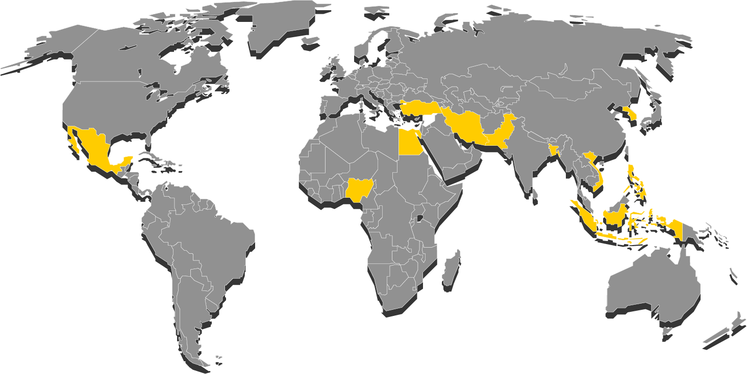 The Next Eleven – or “N-11” – was coined by Jim O’Neill and his Goldman Sachs colleagues in 2005 and consists of eleven emerging markets with huge economic potential: Bangladesh, Egypt, Indonesia, Iran, Mexico, Nigeria, Pakistan, the Philippines, Turkey, South Korea and Vietnam.