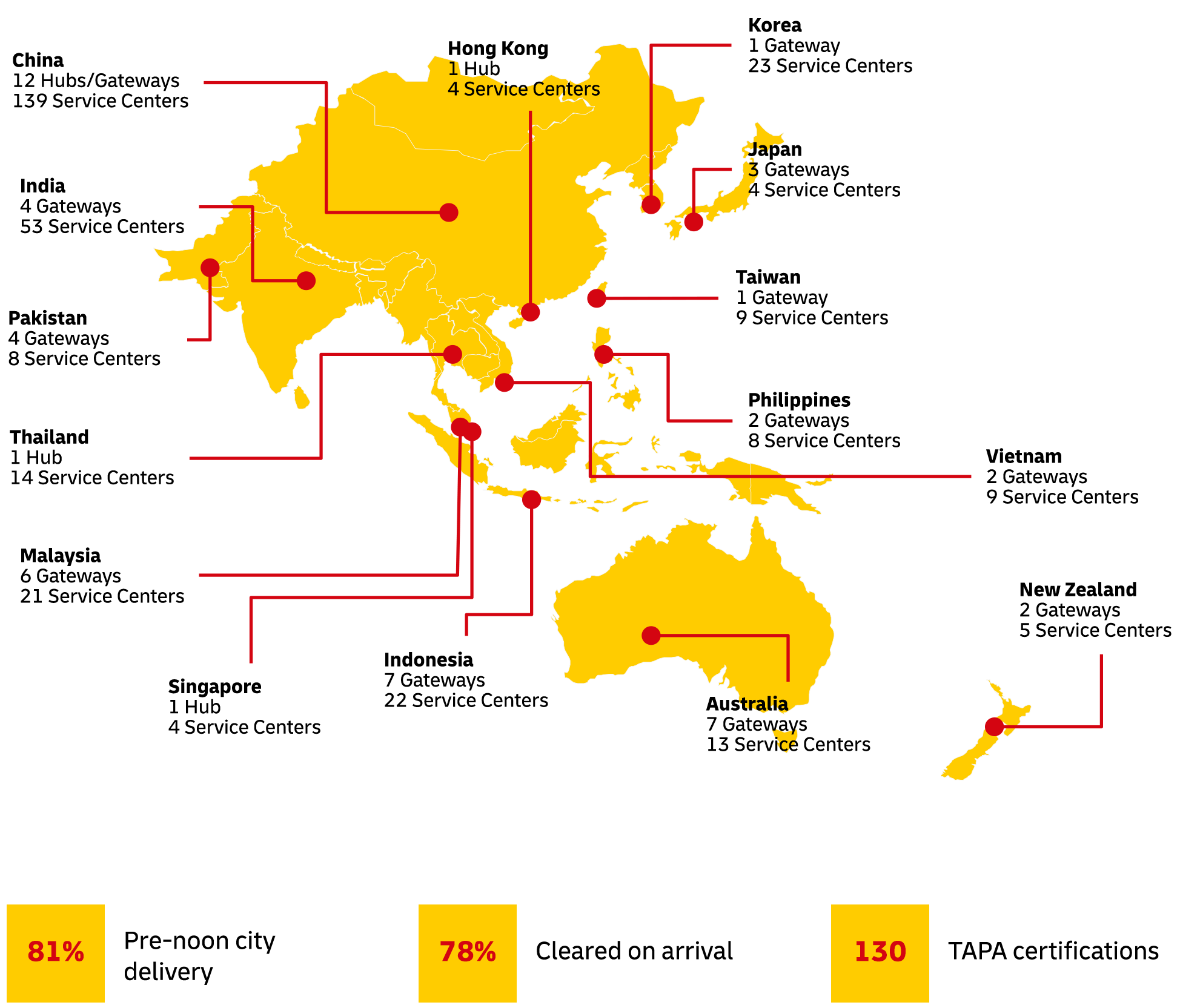 Largest number of facilities, dedicated flights, service points and service centres in the region.