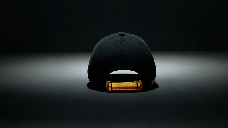 La gorra presenta un elegante diseño negro con solo un breve guiño a DHL a través de una correa ajustable a rayas rojas y amarillas en la parte posterior. "La suma de todos los componentes que han entrado en ella es la historia interesante", explica Alex.