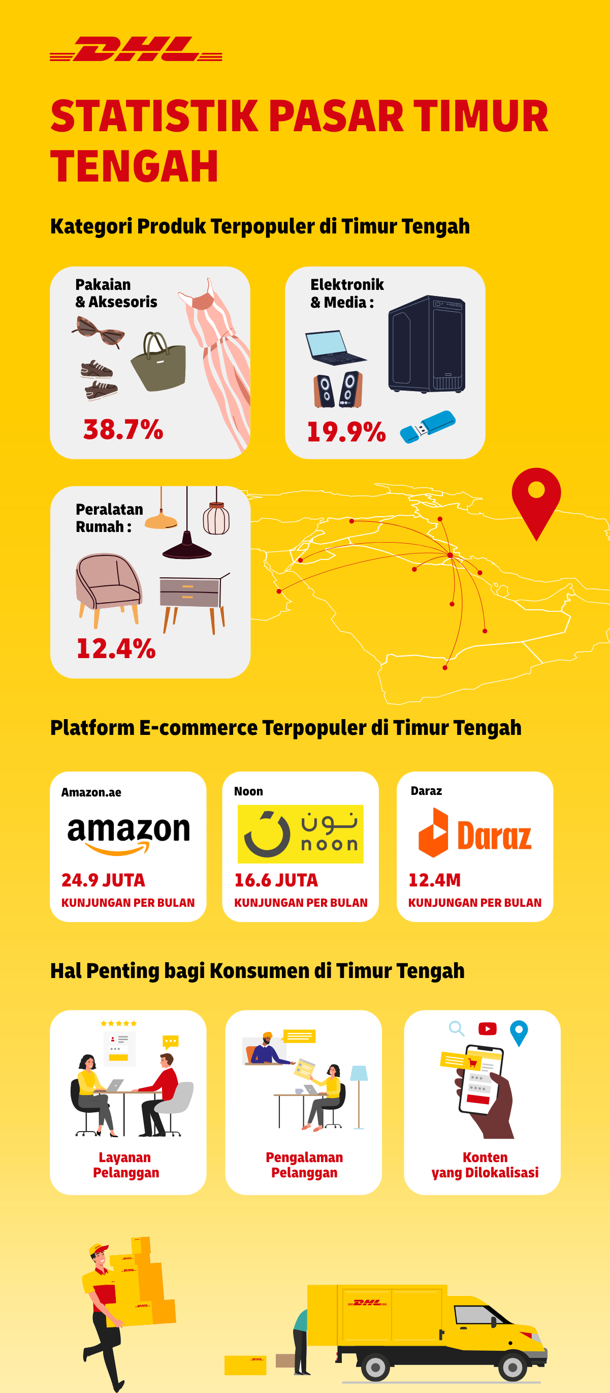 Logistik yang efisien juga penting untuk pertumbuhan e-commerce; bermitra dengan layanan pengiriman yang andal seperti DHL Express di Indonesia dan menetapkan kebijakan pengembalian yang jelas dapat meningkatkan kepuasan pelanggan secara signifikan. Layanan pelanggan yang luar biasa, menampilkan dukungan multibahasa dan pengalaman yang dipersonalisasi, menumbuhkan loyalitas dan dari mulut ke mulut yang positif. Terakhir, menerapkan strategi pemasaran yang ditargetkan, seperti kolaborasi influencer dan konten lokal, secara efektif menjangkau dan beresonansi dengan audiens Timur Tengah.