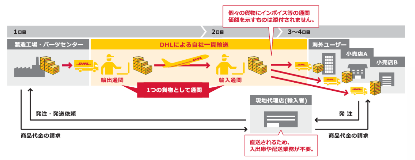 輸⼊通関後は、DHLが個別の貨物として海外ユーザーや⼩売店へ配送*¹します。製造⼯場やパーツセンターから複数のユーザー や⼩売店まで、3〜4⽇*²でスピーディーに配送いたします。