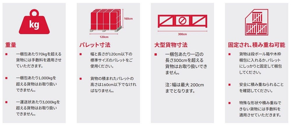 - パレットサイズの上限: 300cm(⻑さ)× 200cm(幅)× 160cm(⾼さ)