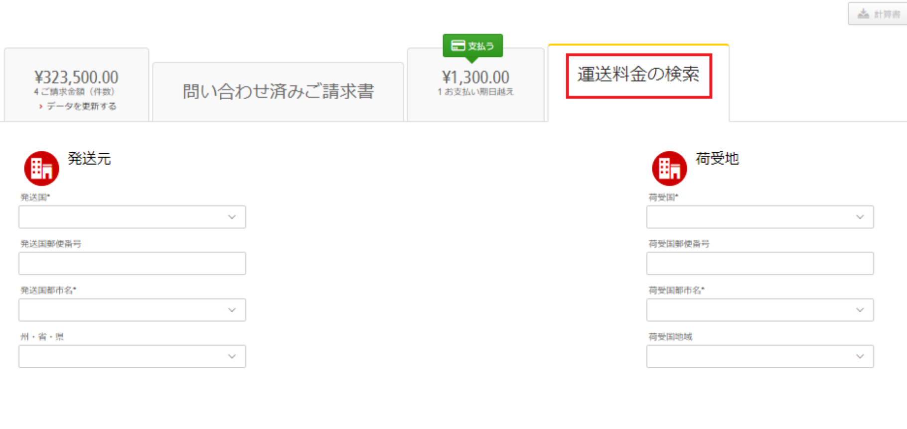 まず、ダッシュボード画⾯の「運送料⾦の検索」タブをクリックし、必要な情報を⼊⼒してください。