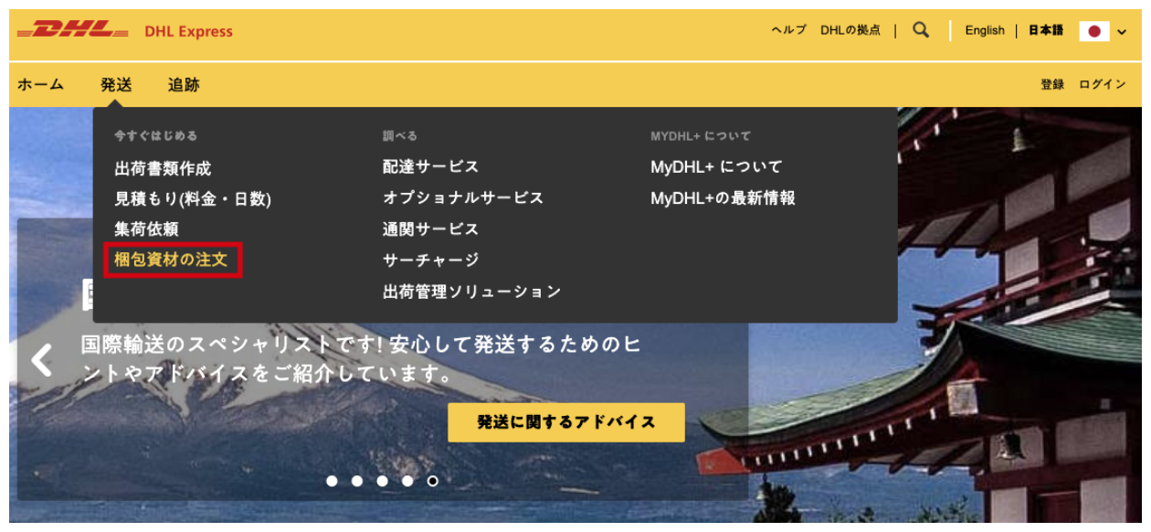 MyDHL+ より「発送」→「梱包資材の発注」を選択、またはオンラインサプライオーダーページにアクセス