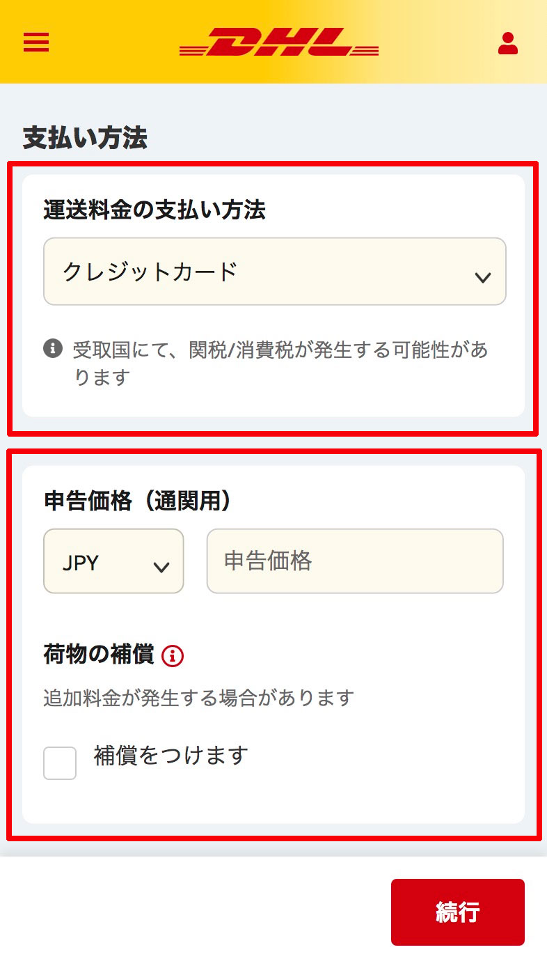 荷物の発送⽬的を選択し、クレジットカ ードを選択します。 通関⽤に必要になる荷物の申告価格を⼊ ⼒してください。 荷物に保証を付ける場合は、チェックを ⼊れてください。