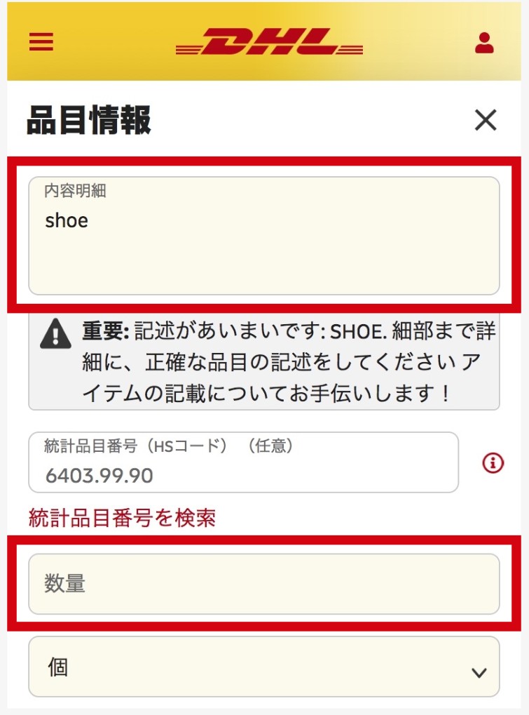 統計品⽬番号(HSコード)を選択後、荷物の数量‧重量‧1つあたりの⾦額と原産国を⼊⼒してください。