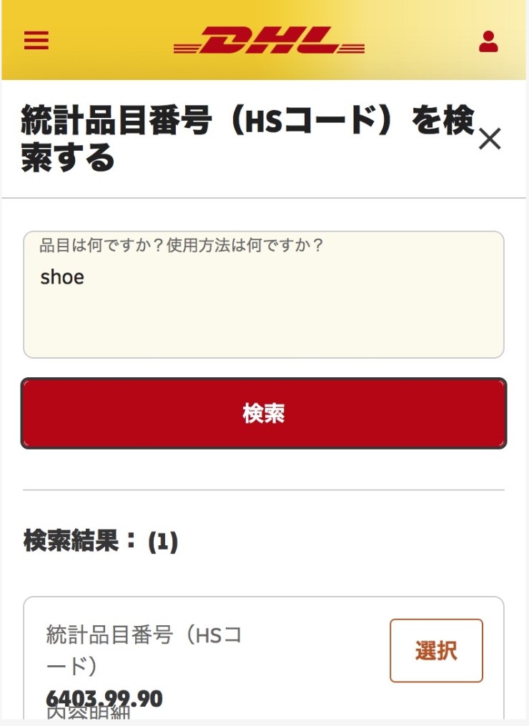 内容明細に荷物を⼊⼒し(半⾓英数字)、「統計品⽬番号(HSコード)を検索」し、検索結果から荷物に該当する統計品⽬番号を選択します。