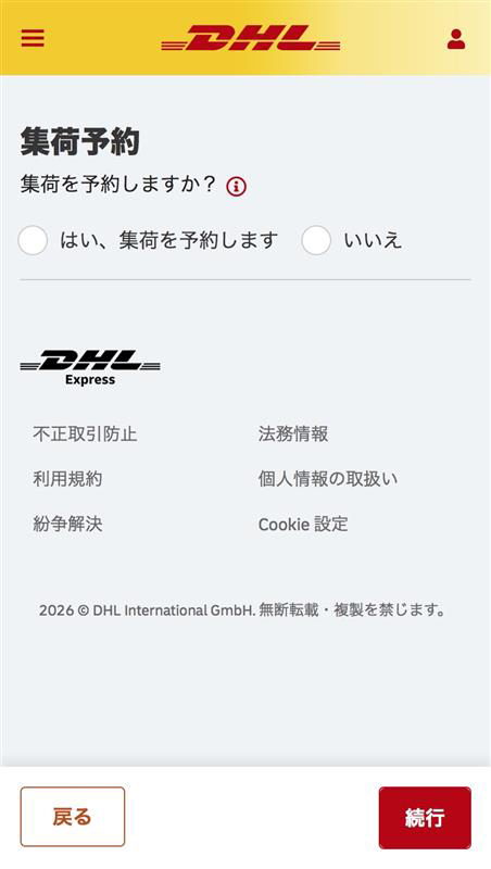 集荷せず、DHLサービスポイントへお持込みいただく場合は、「いいえ」を選択してください。