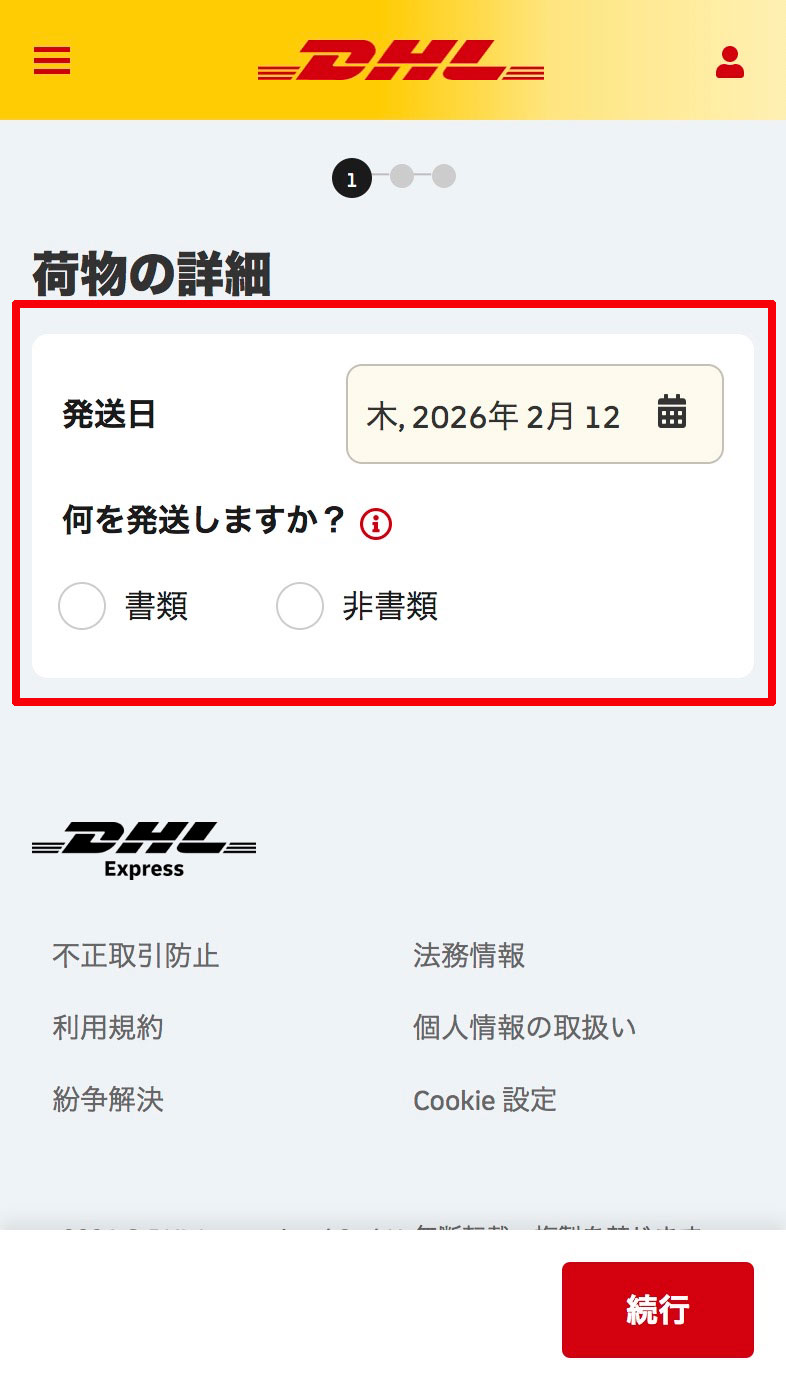 発送⽇と荷物の種類を選択し、発送⼈‧受取⼈情報を⼊⼒