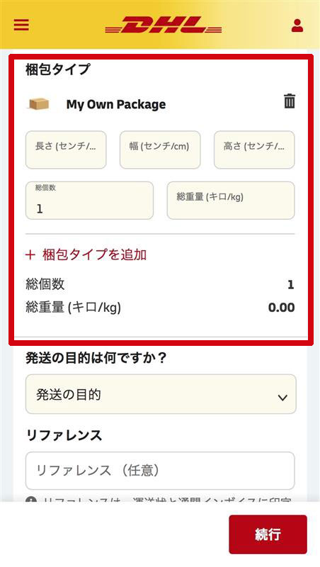 住所を⼊⼒後、発送する荷物の梱包材サ イズと数量、総重量を⼊⼒します。 以降、書類か⾮書類によって⼊⼒内容が ことなります。