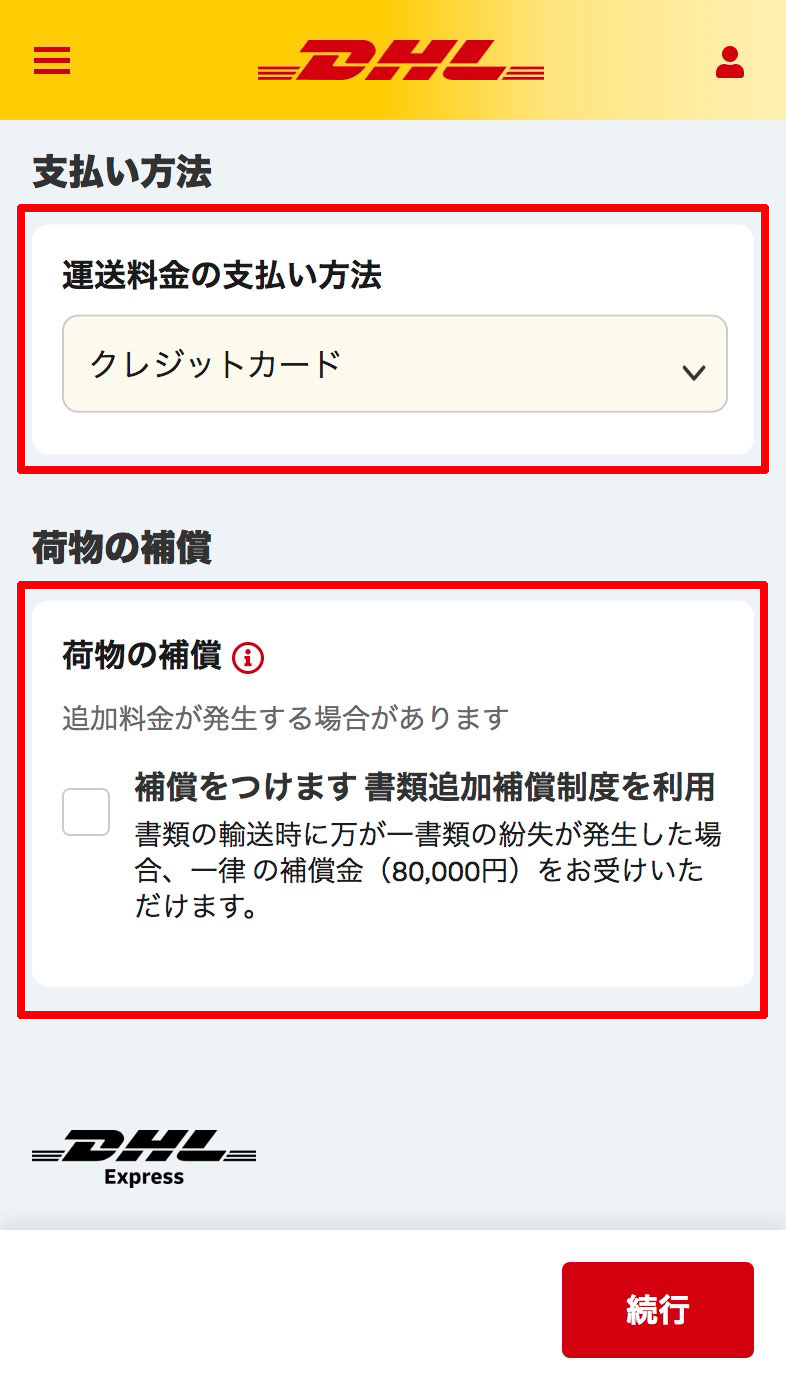 書類の内容をリストから選択し、クレジ ットカードを選択します。 荷物に補償を付ける場合は、チェックを いれてください。
