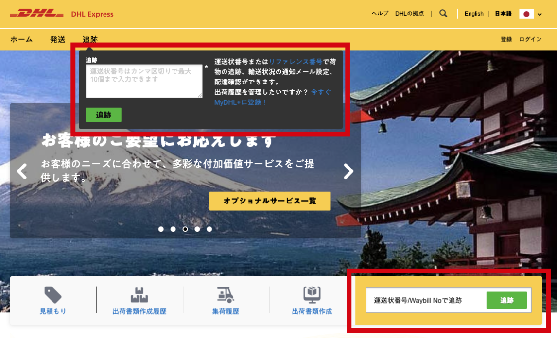MyDHL+(オンラインシッピングサイトツール)に、荷物の10桁の運送状番号(Waybill No.)を⼊⼒すると 荷物の輸送状況を確認できます。