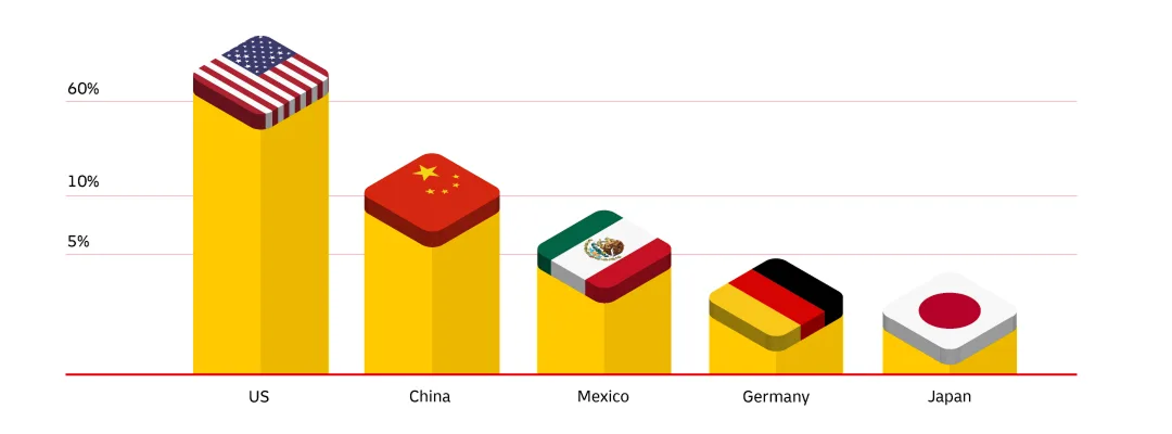 캐나다의 최대 수입국은 미국으로, 전체 수입 물량의 60% 이상을 미국에 의존하고 있습니다. 그 다음으로는 중국이 뒤를 잇고 있으며, 이후 멕시코와 독일이 주요 수입국으로 꼽힙니다.