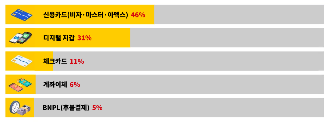 해외 직구가 많은 시장 특성으로 국경 간 결제 시 신뢰도가 높은 수단으로 널리 활용되고 있습니다.