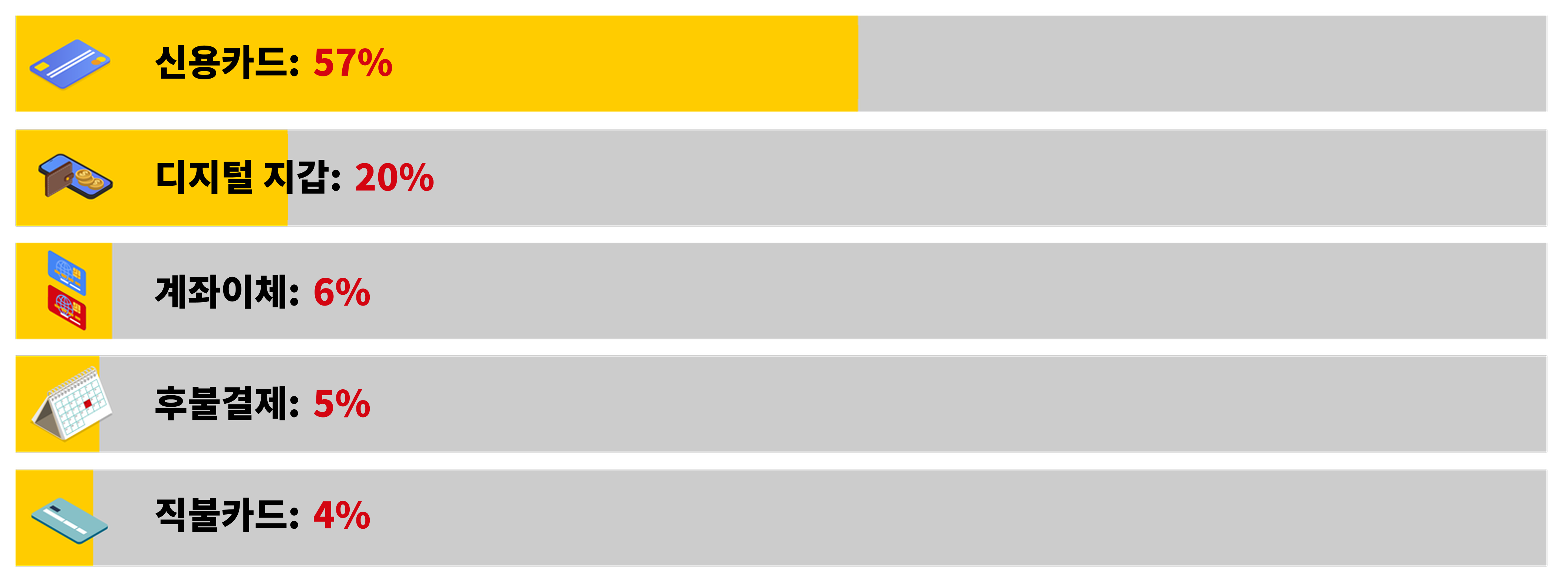 일본 온라인 결제 수단 중 가장 큰 비중을 차지하는 것은 신용카드로 전체의 절반 이상을 차지하고 있습니다. 그 뒤를 이어 디지털 지갑, 계좌이체(A2A), 후불 결제, 직불카드 순으로 이용되고 있습니다. 이는 일본 소비자들이 신뢰성과 편의성을 중시하면서도 다양한 결제 옵션을 선호하고 있음을 보여줍니다.