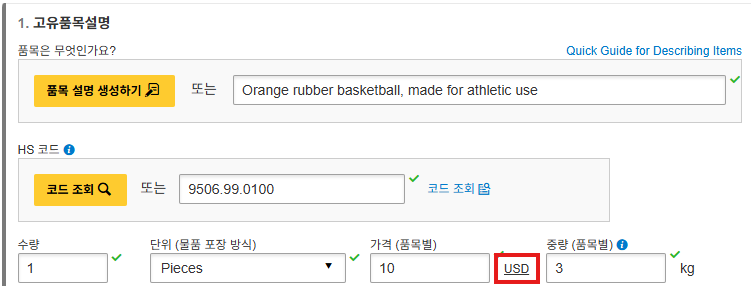 A. **[발송물 세부 사항]**에서 가격 입력란 옆의 ‘USD’ 단위 를 클릭하면 통화 단위를 변경할 수 있습니다.