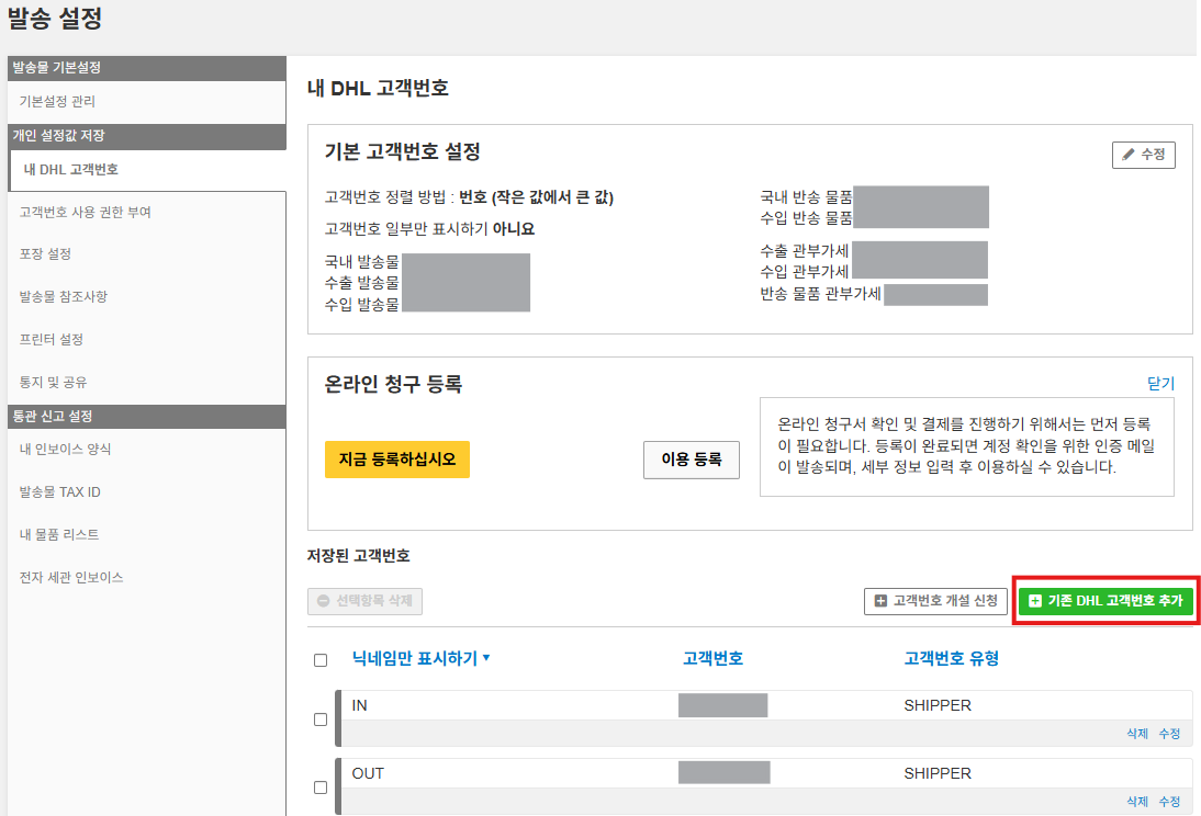 A. MyDHL+의 **[발송 설정] → [내 DHL 고객번호] → [기존 DHL 고객번호 추가] 에서 고객번호를 등록한 뒤 다시 확인 부탁드립니다.