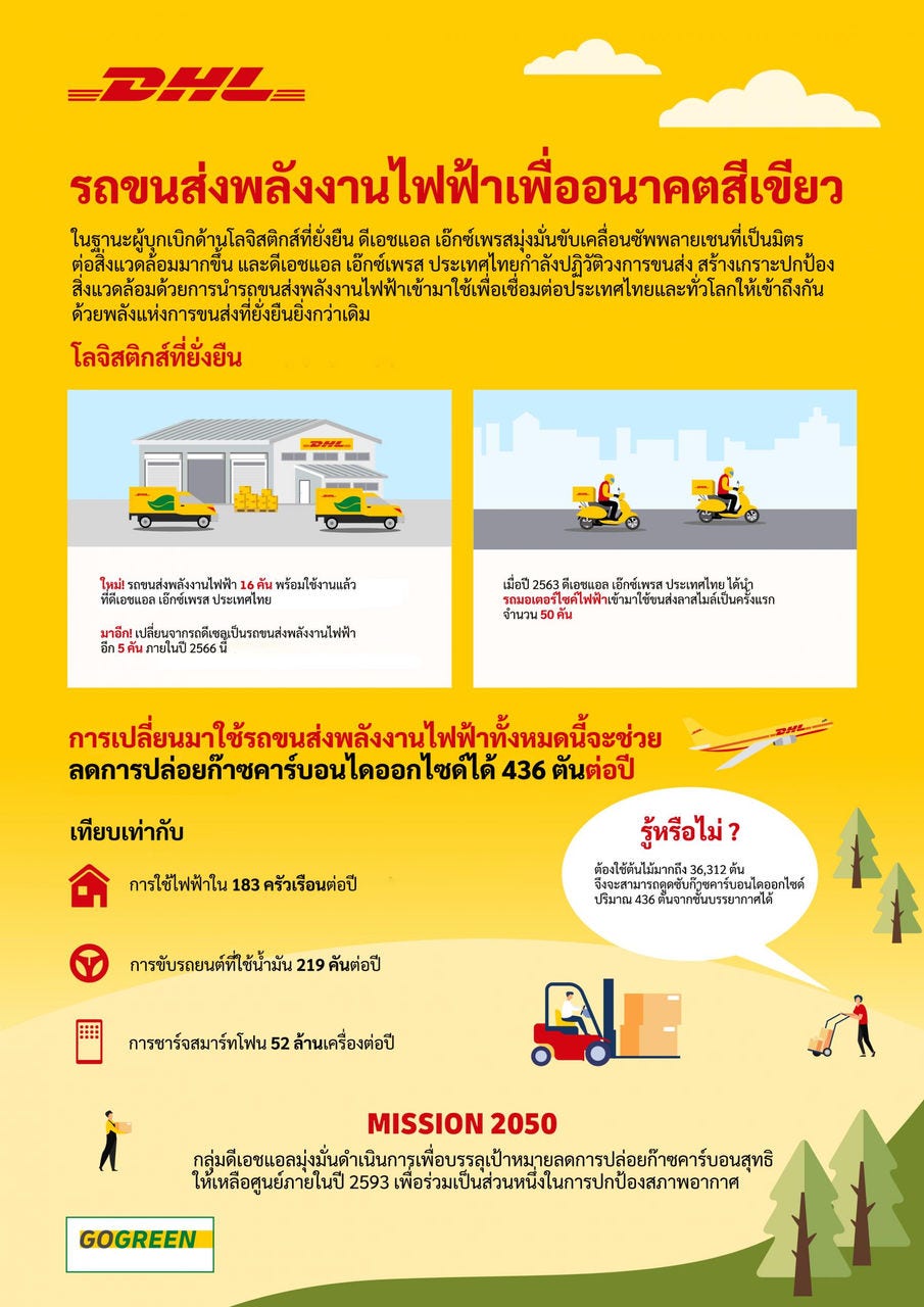 - ภายในปี 2566 ดีเอชแอลจะมีรถขนส่งพลังงานไฟฟ้า 71 คันให้บริการในประเทศไทย
