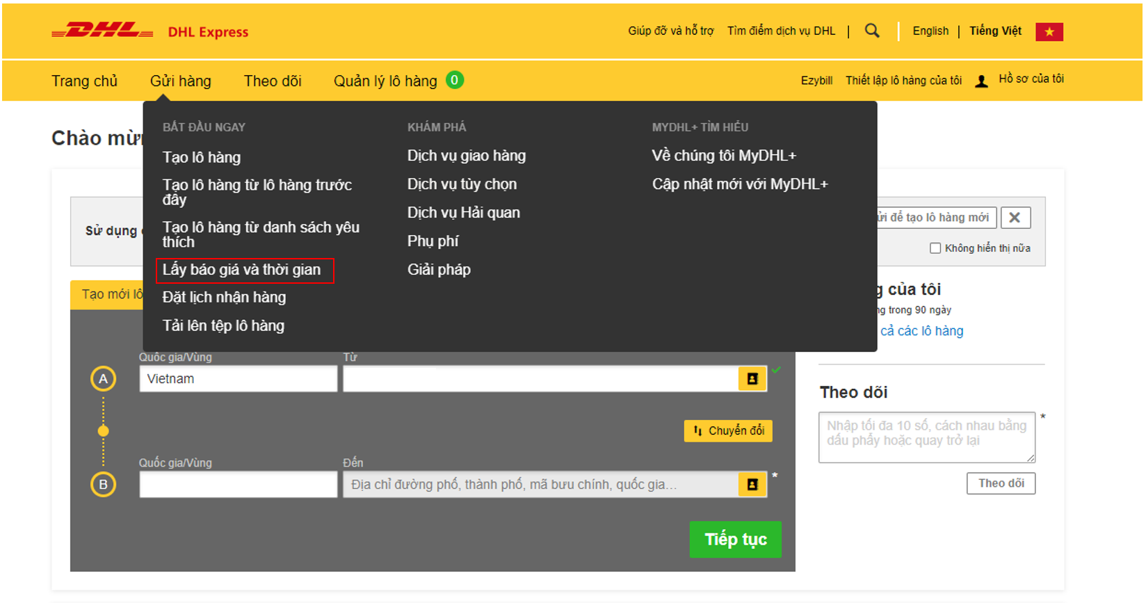 - Nhấp vào ‘Gửi hàng' và chọn ‘Lấy báo giá và thời gian' trên thanh menu trên cùng.