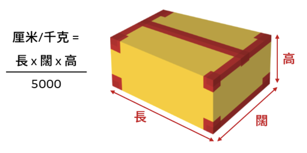 體積重的計算公式為:長(cm)× 寬(cm)× 高(cm)÷ 5000。得出計費重量後,每0.5公斤為計算單位,即如計費重量是1.3 公斤,便會按1.5公斤收費。