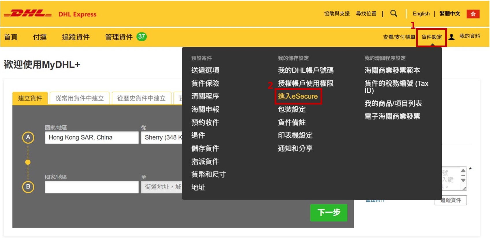 步驟 1: 登入 MyDHL+ 後,到右上角點選「貨件設定」 (My Shipment Settings),