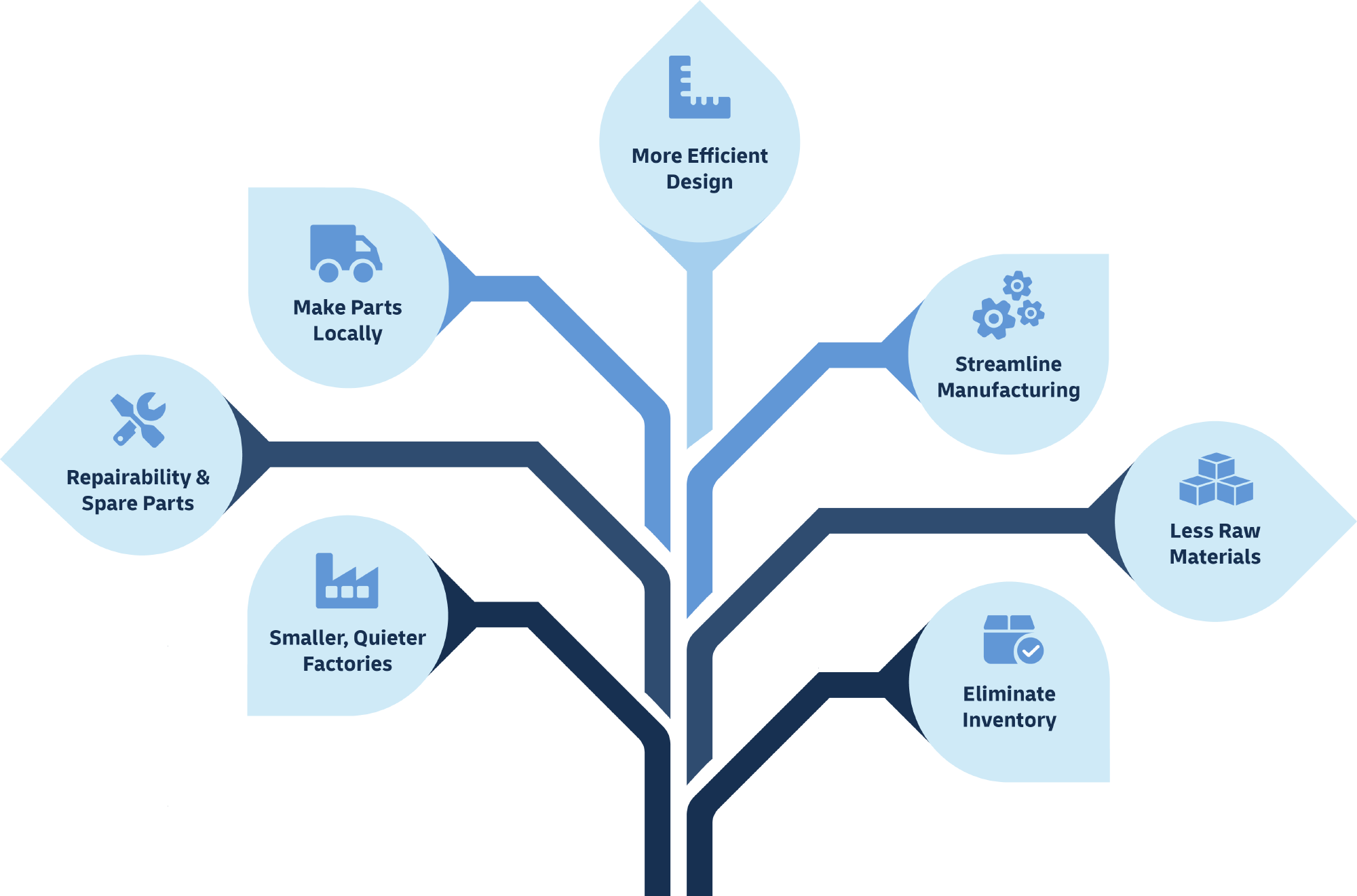 3D printing was initially used for rapid prototyping to accelerate product design processes. Today, with further technology development and maturation, it has been more widely adopted for larger batch size production across automotive, medical, aerospace, and other industries to create many different objects in a variety of materials. It offers the opportunity to reduce the weight of parts and to 3D print complex parts in one piece.