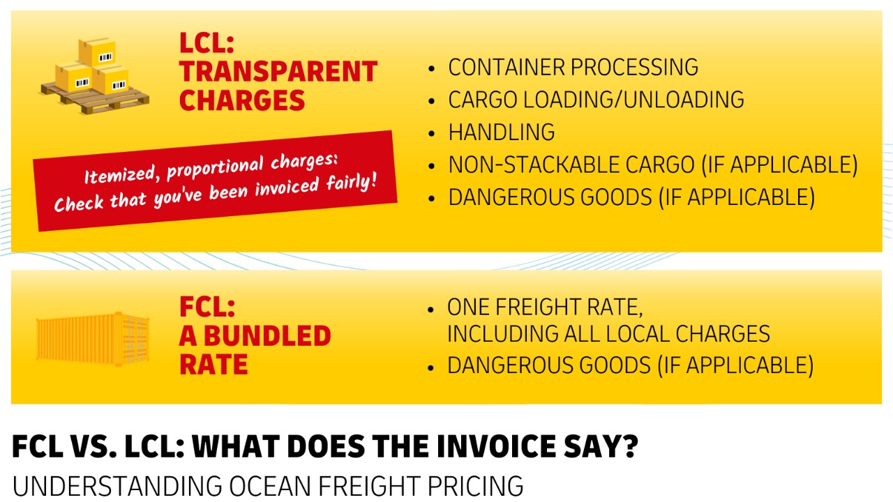 Before you use less than container load (LCL) ocean shipping, you’ll want to drill down into the various charges. You’ll find there are more items on an LCL invoice than on a full container load (FCL) invoice, which can be daunting to begin with. But everything should add up to a cost-effective shipping solution.
