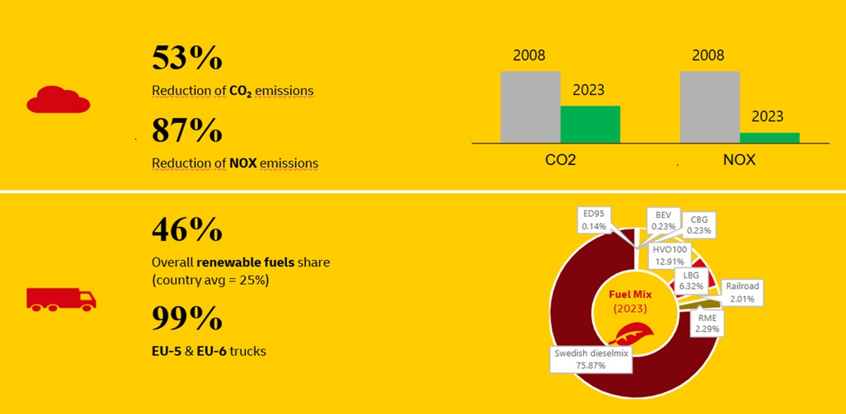 Vi på DHL Freight fokuserar på att öka andelen förnybart bränsle, elfordon i urbana områden och nå standarden klimatneutrala byggnader vid egen nybyggnation. Globalt är målsättningen minst 30% procent förnybart bränsle som helhet, men förutsättningarna varierar för olika länder i Europa.